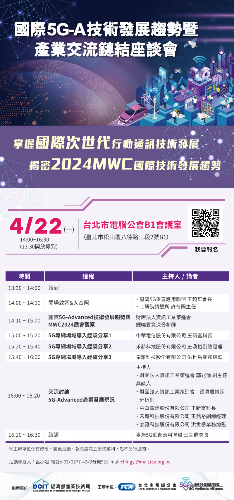 【限定席次】秒速接軌國際5G-Advanced技術發展趨勢 4/22@國際5G-A技術發展趨勢暨產業交流鏈結座談會